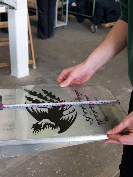Nun werden die Paletten für die Fixierung der Baumwolltaschen vorbereitet. Dazu werden die Paletten gesäubert und auf jeder Palette ein saugfähiges, selbstklebendes Spezialpapier aufgebracht, das anschließend mit einem Fixierleim bestrichen wird. Dieser Leim verhärtet bei Hitze und ermöglicht es, dass die auf die Paletten gezogenen Baumwolltaschen während des Druckvorganges nicht verrutschen können. Das ist eine der Grundvoraussetzungen, dass das Druckmotiv sauber auf die Baumwolltaschen aufgebracht werden kann und später, nach dem Druck, keine „Blitzer“ zu sehen sind.